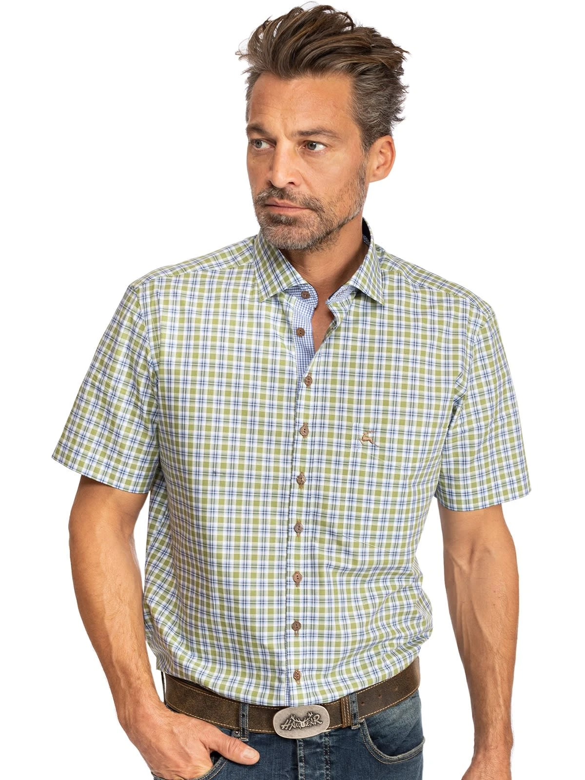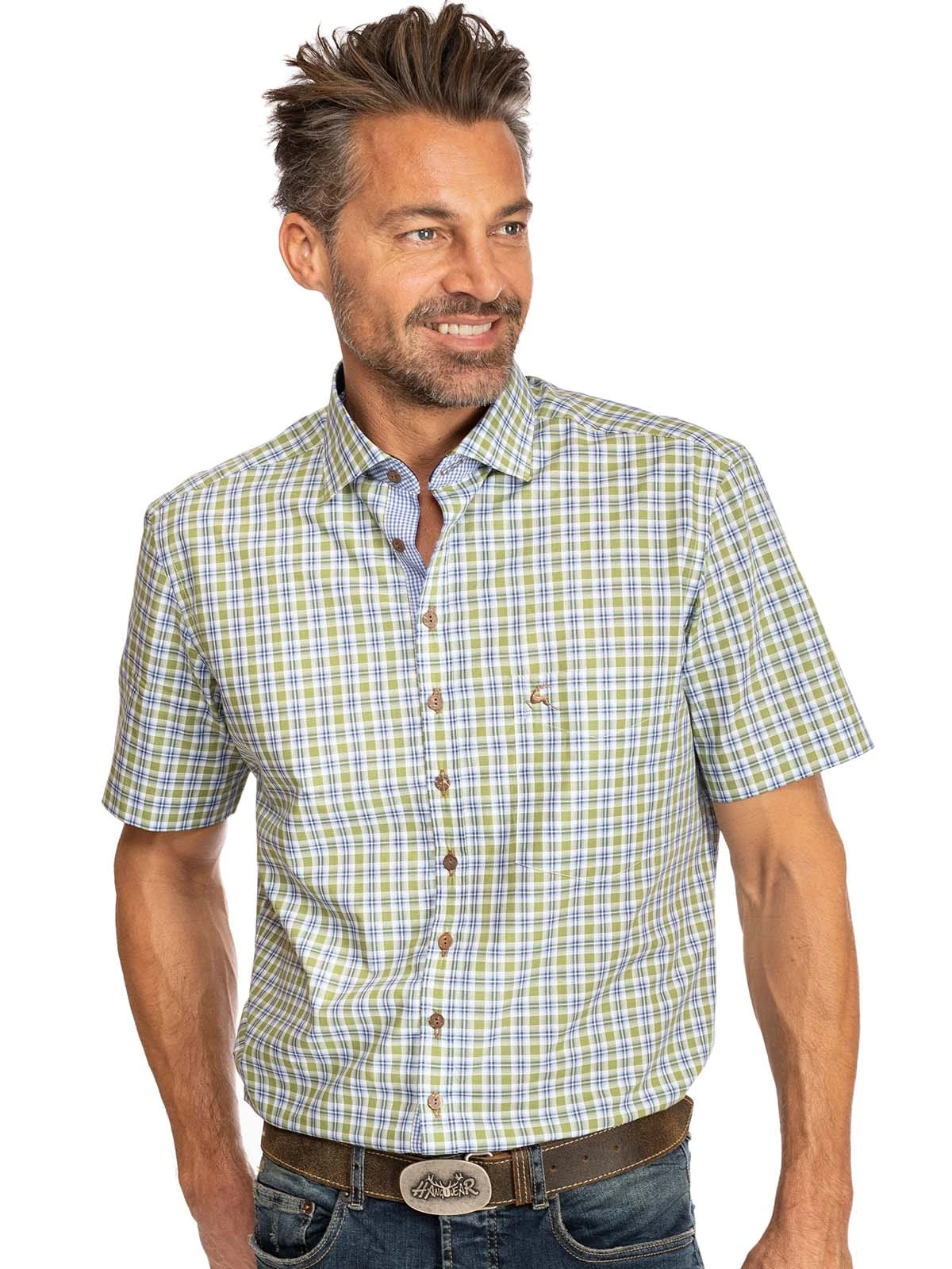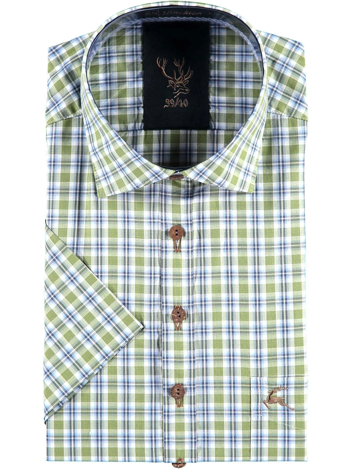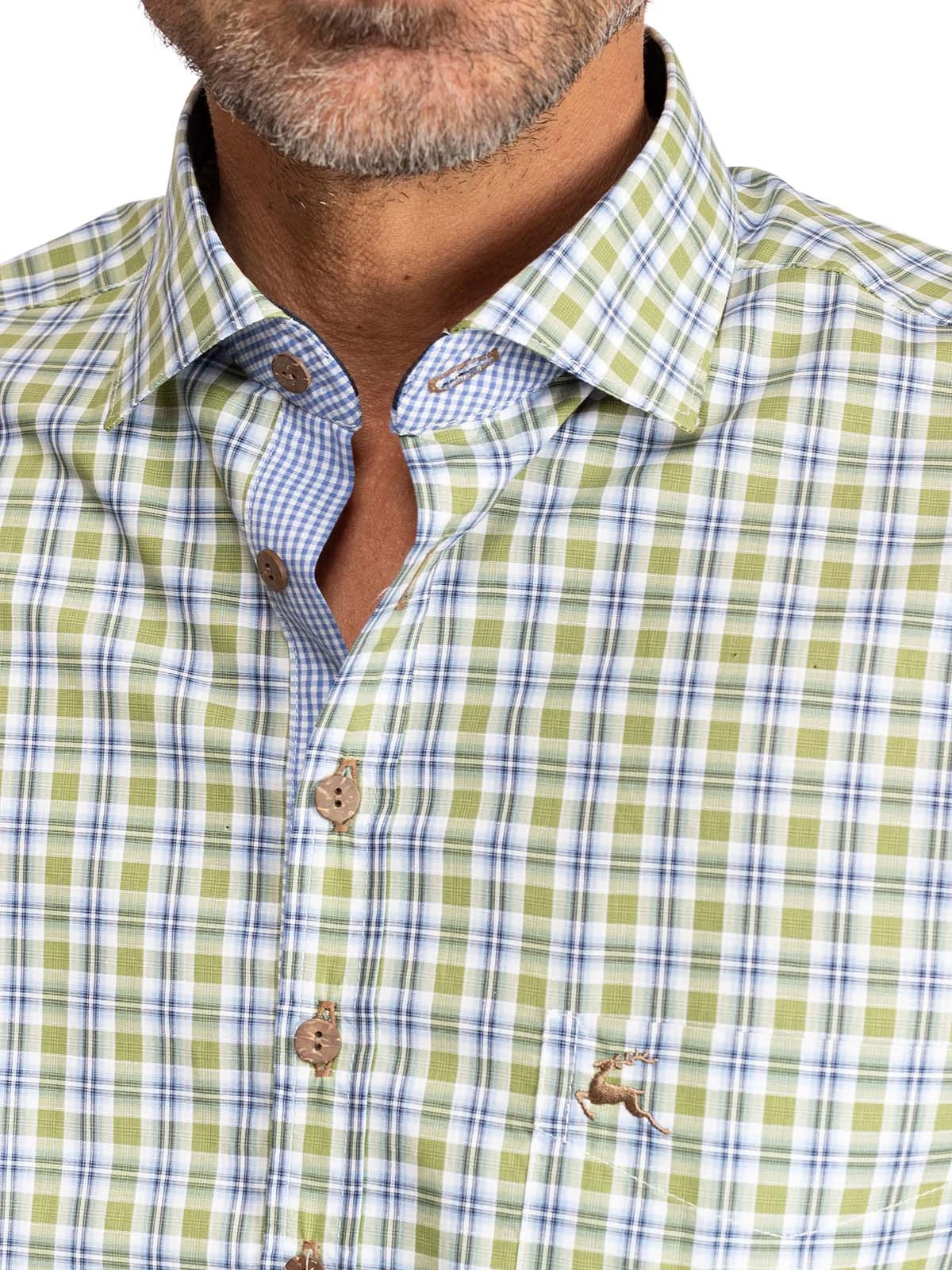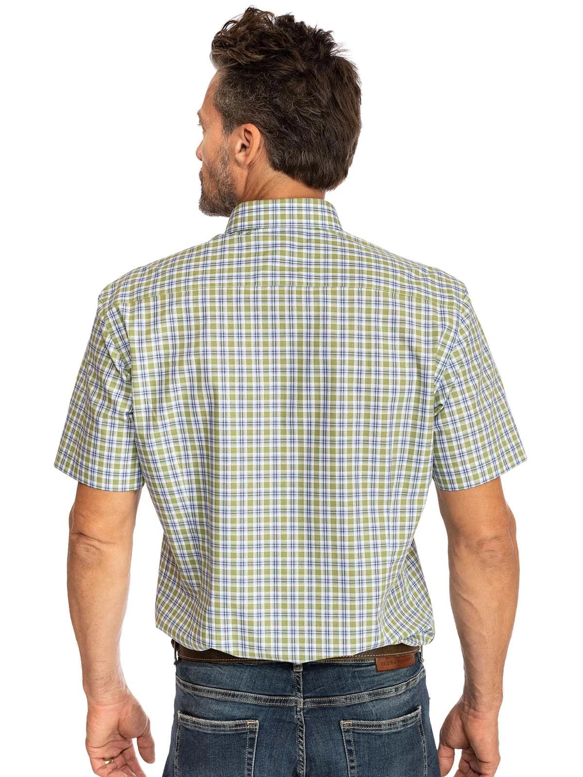 Luftiges Kurzarmhemd mit grünen Karos. Ein grün-blaues Karomuster auf weißem Grund bedeckt den leichten Baumwollstoff, der vor allem an warmen Tagen einen hohen Tragekomfort bietet. Das kurzärmelige Hemd von OS-Trachten eignet sich für vielerlei Zwecke und ist ein echter Allrounder im Kleiderschrank. Ideal für die Freizeit und den Beruf.•Dieses Trachtenhemd fällt größegerecht aus. •100% Baumwolle •OS-Trachten •Schonwäsche