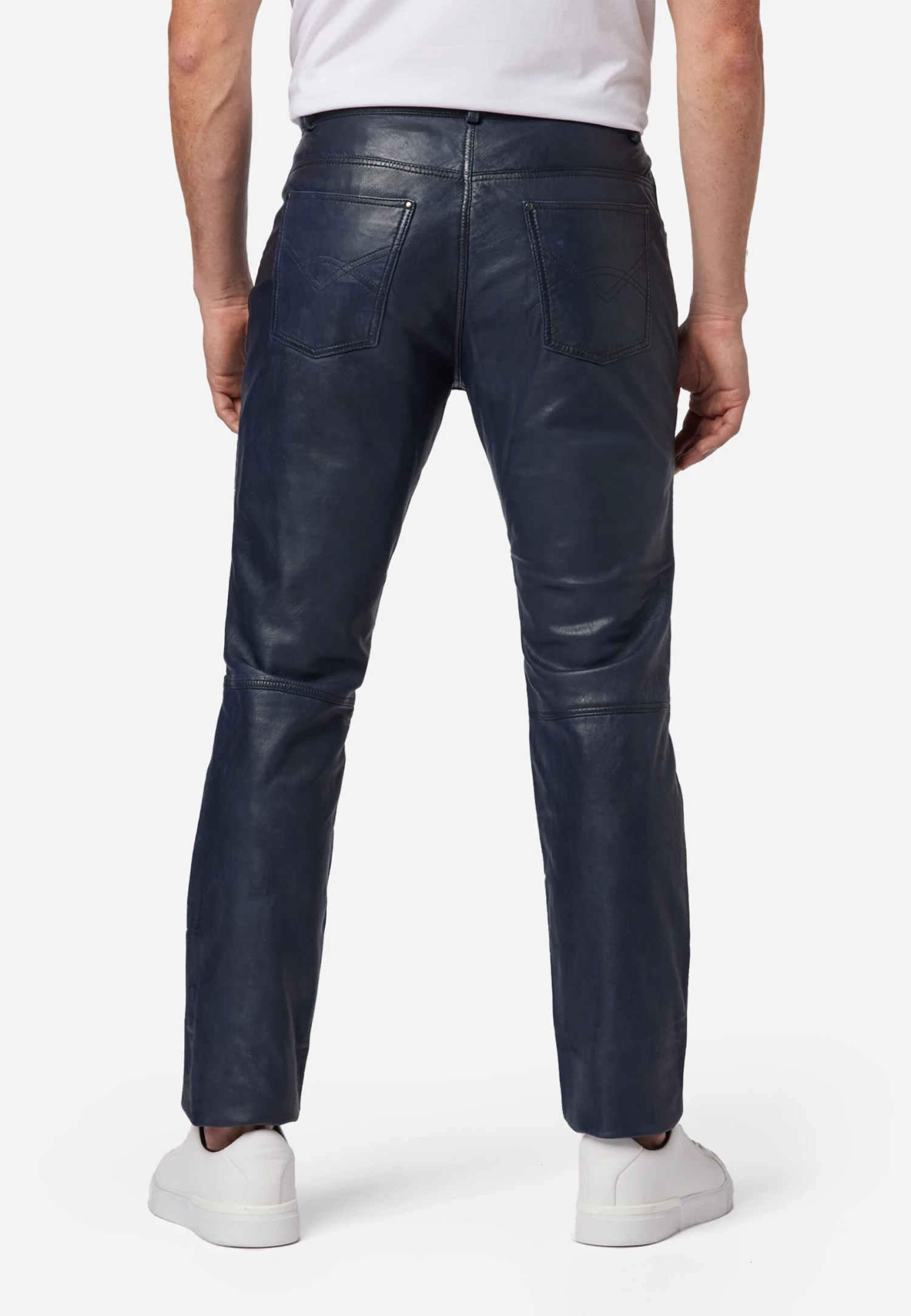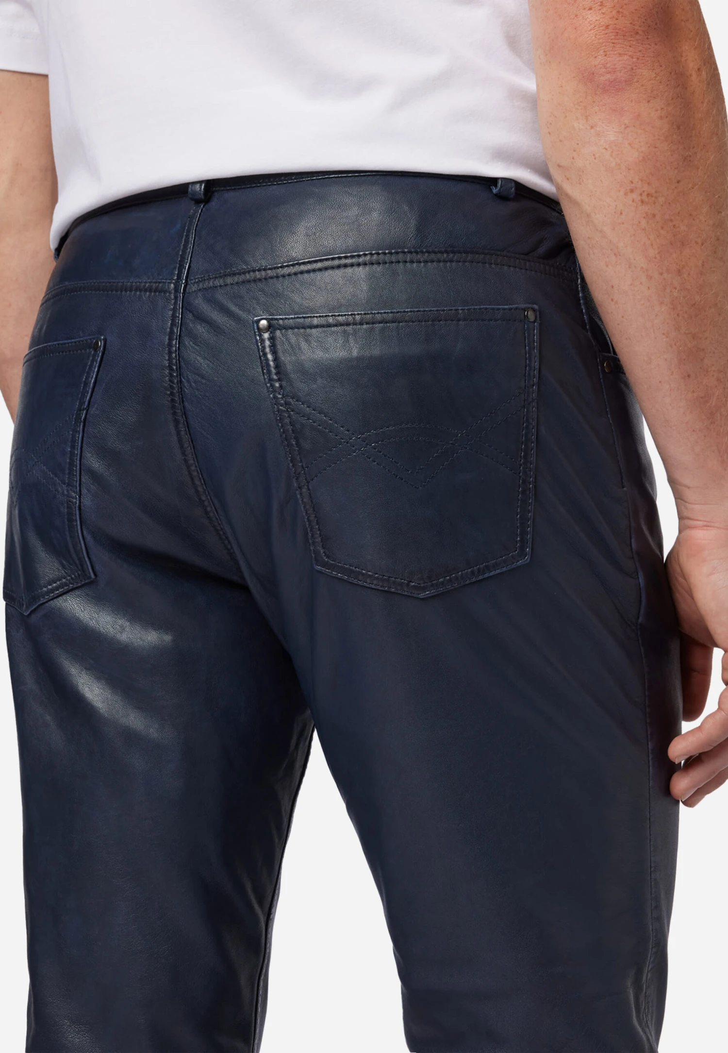 Lederhose Trant Pant in Blau für Herren von Ricano® aus Lamm-Nappa Leder – 5-Pocket-Stil – Regular Waist / Medium Rise – Bequemer und klassischer Straight Leg Cut – Futter: 100% atmungsaktives Polysatin – Ganzjahresartikel – von Frühling bis Winter zu jeder Jahreszeit passend – Größenausfall: Artikel fällt größengerecht aus . Enthält nichttextile Bestandteile tierischen Ursprungs.