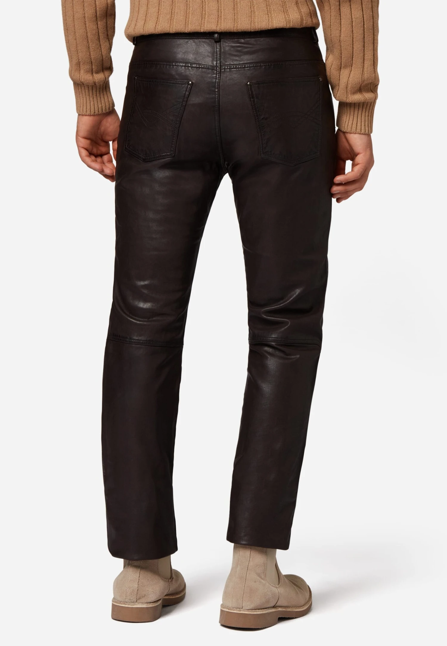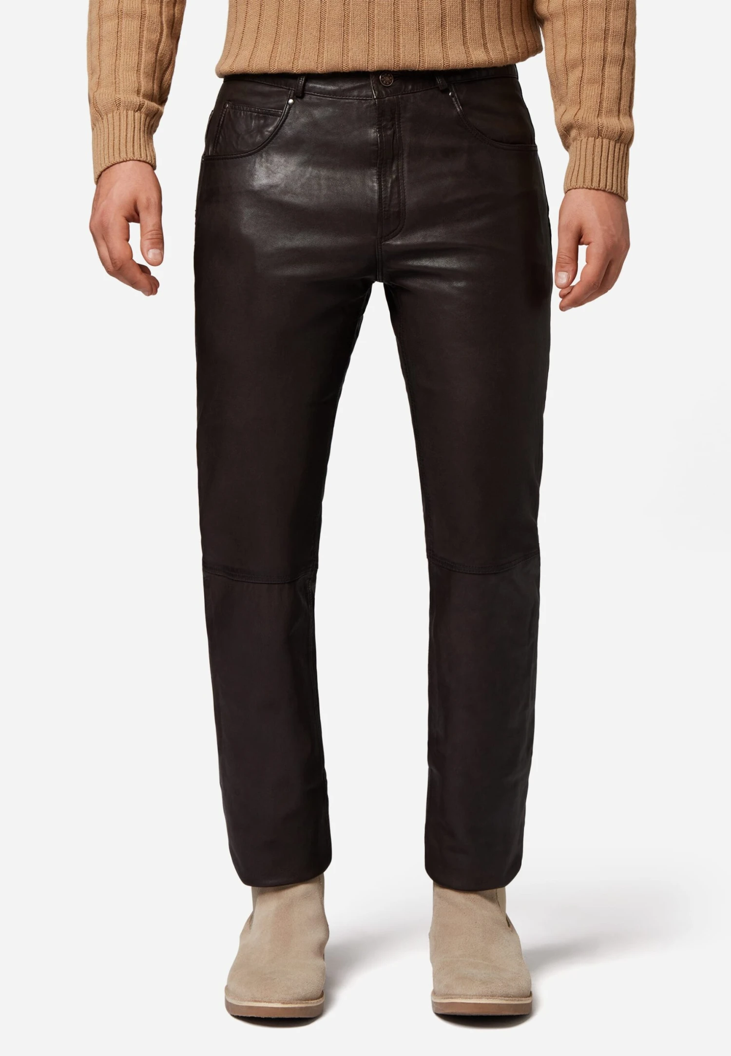Lederhose Trant Pant in Braun für Herren von Ricano® aus Lamm-Nappa Leder – 5-Pocket-Stil – Regular Waist / Medium Rise – Bequemer und klassischer Straight Leg Cut – Futter: 100% atmungsaktives Polysatin – Ganzjahresartikel – von Frühling bis Winter zu jeder Jahreszeit passend – Größenausfall: Artikel fällt größengerecht aus . Enthält nichttextile Bestandteile tierischen Ursprungs.